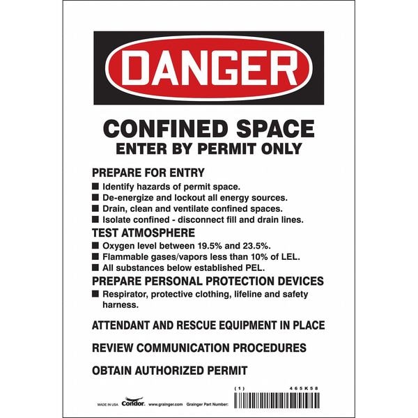 Safety Sign, Horizontal Rectangle, Number of Printed Sides 1, English, Sign Format Traditional OSHA, Sign Legend Confined Space Enter By Permit Only Prepare For Entry Test Atmosphere Prepare Personal Protection Devices Attendant And Rescue Equipment In Place Review Communication Procedures Obtain Authorized Permit, Sign Legend Background Color White, Sign Legend Style Text