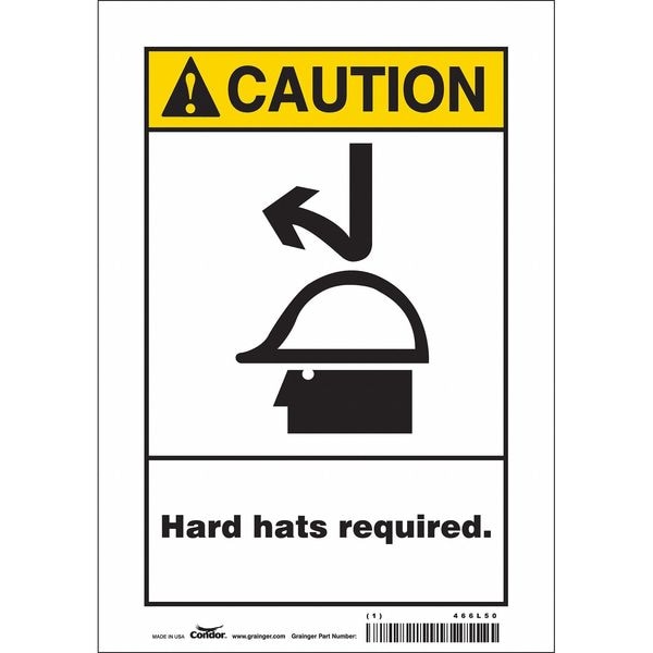 Safety Sign, Horizontal Rectangle, Number of Printed Sides 1, English, Sign Format ANSI/OSHA Format, Sign Legend Hard Hats Required., Sign Legend Background Color White, Sign Legend Style Symbol and Text