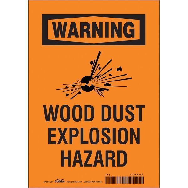 Safety Sign, Horizontal Rectangle, Number of Printed Sides 1, English, Sign Format Traditional OSHA, Sign Legend Wood Dust Explosion Hazard, Sign Legend Background Color Orange, Sign Legend Style Symbol and Text