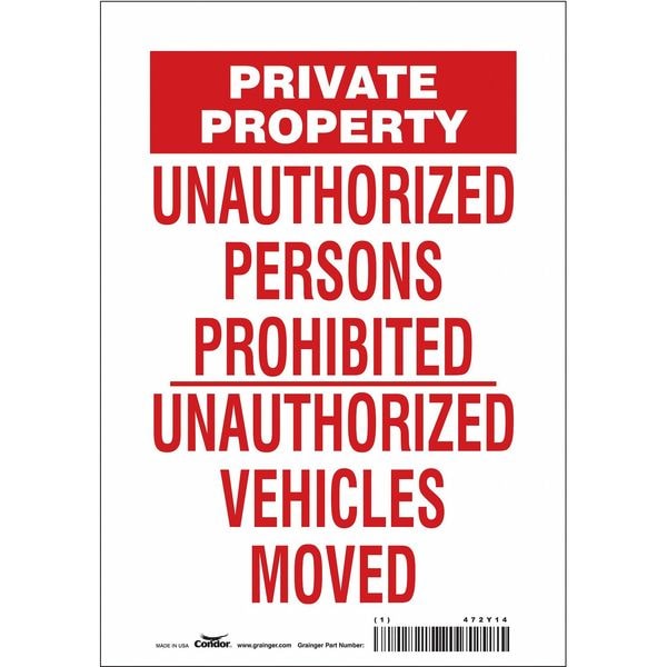 Safety Sign, Horizontal Rectangle, Number of Printed Sides 1, English, Sign Format Other Format, Sign Legend Unauthorized Persons Prohibited Unauthorized Vehicles Removed, Sign Legend Background Color Red, White, Sign Legend Style Text