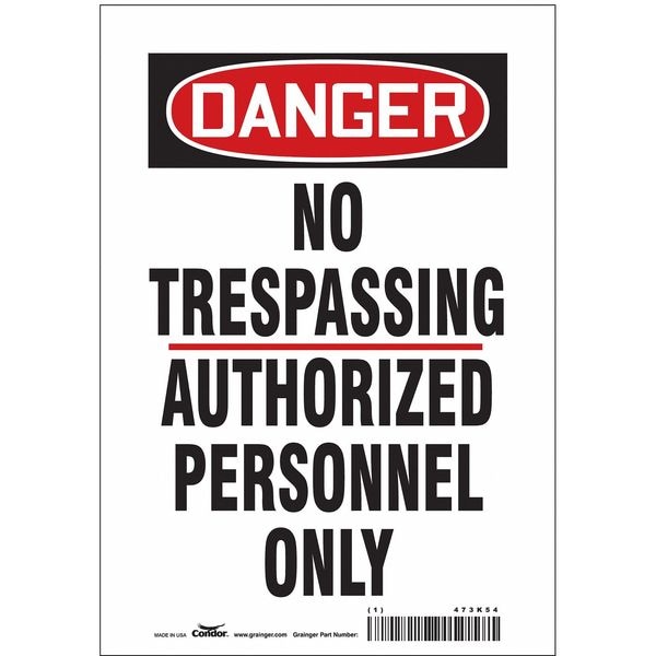 Safety Sign, Horizontal Rectangle, Number of Printed Sides 1, English, Sign Format Traditional OSHA, Sign Legend No Trespassing Authorized Personnel Only, Sign Legend Background Color White, Sign Legend Style Text