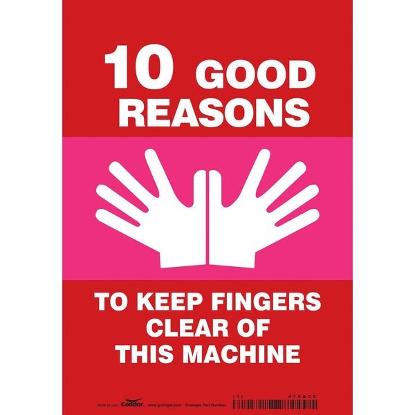 Safety Sign, Horizontal Rectangle, Number of Printed Sides 1, English, Sign Format Other Format, Sign Legend 10 Good Reasons To Keep Fingers Clear Off This Machine, Sign Legend Background Color Red, Sign Legend Style Symbol and Text