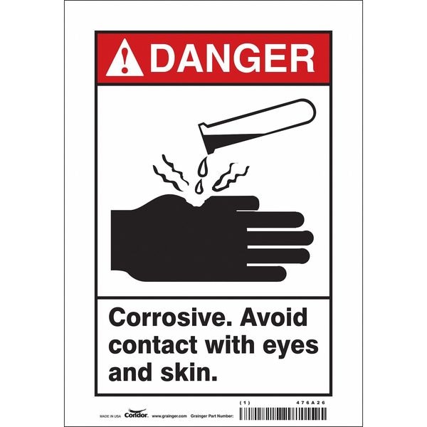 Safety Sign, Horizontal Rectangle, Number of Printed Sides 1, English, Sign Format ANSI/OSHA Format, Sign Legend Corrosive. Avoid Contact With Eyes And Skin., Sign Legend Background Color White, Sign Legend Style Symbol and Text
