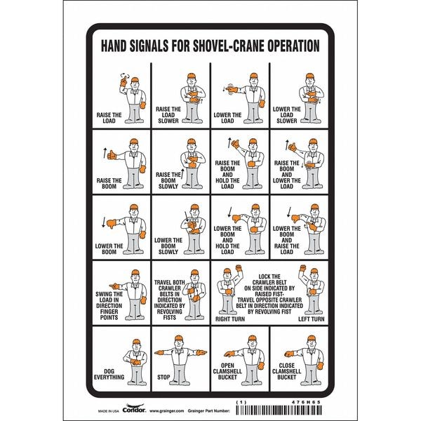 Safety Sign, Horizontal Rectangle, Number of Printed Sides 1, English, Sign Format Other Format, Sign Legend Hand Signals For Shovel-Crane Operation, Sign Legend Background Color White, Sign Legend Style Symbol and Text