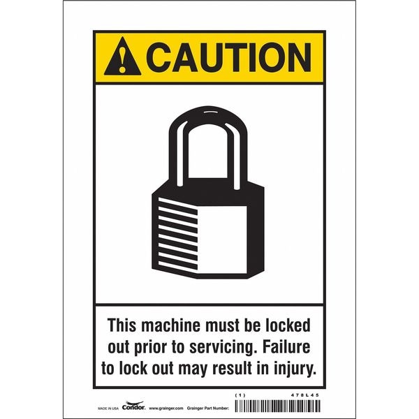 Safety Sign, Horizontal Rectangle, Number of Printed Sides 1, English, Sign Format ANSI/OSHA Format, Sign Legend This Machine Must Be Locked Out Prior To Servicing. Failure To Lock Out May Result In Injury., Sign Legend Background Color White, Sign Legend Style Symbol and Text