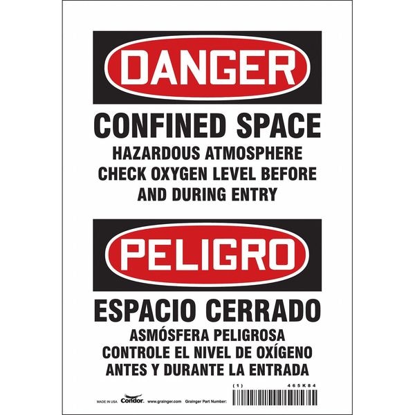 Safety Sign, Horizontal Rectangle, Number of Printed Sides 1, English, Spanish, Sign Format Traditional OSHA, Sign Legend Confined Space Hazardous Atmosphere Check Oxygen Level Before And During Entry/Espacio Cerrado Atmosfera Peligrosa Controle El Nivel De Oxigeno Antes Y Durante La Entrada, Sign Legend Background Color White, Sign Legend Style Text