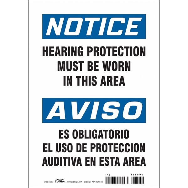 Safety Sign, Horizontal Rectangle, Number of Printed Sides 1, English, Spanish, Sign Format Traditional OSHA, Sign Legend Hearing Protection Must Be Worn In This Area/Es Obligatorio El Uso De Proteccion Auditiva En Esta Area, Sign Legend Background Color White, Sign Legend Style Text