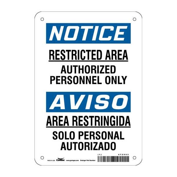 Safety Sign, Horizontal Rectangle, Number of Printed Sides 1, English, Spanish, Sign Format Traditional OSHA, Sign Legend Restricted Area Authorized Personnel Only/Area Restringida Solo Personel Autorizado, Sign Legend Background Color White, Sign Legend Style Text