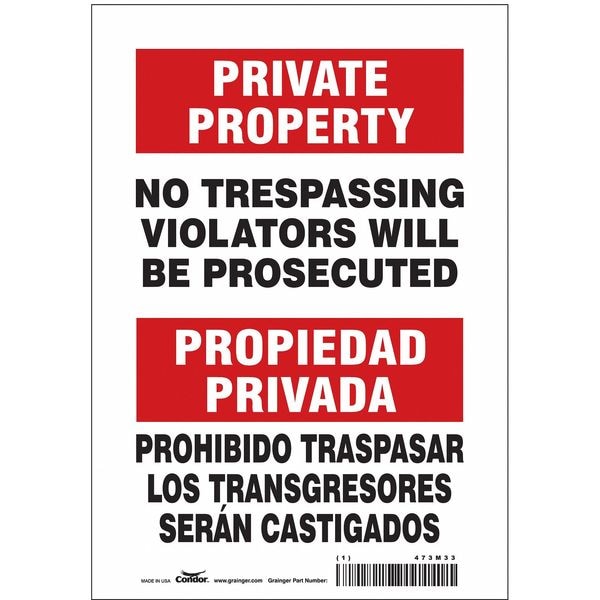 Safety Sign, Horizontal Rectangle, Number of Printed Sides 1, English, Spanish, Sign Format Other Format, Sign Legend No Trespassing Violators Will Be Prosecuted/Propiedad Privada Prohibido Traspasar Los Transgresores Seran Castigados, Sign Legend Background Color Red, White, Sign Legend Style Text