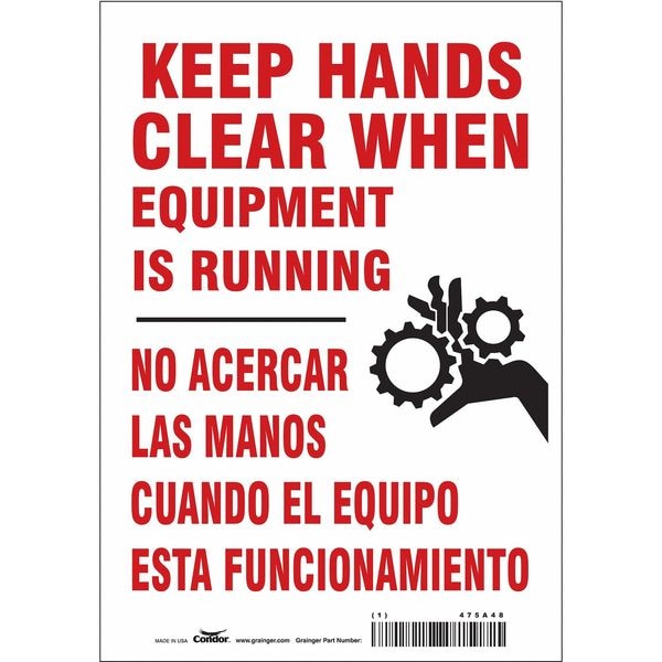 Safety Sign, Horizontal Rectangle, Number of Printed Sides 1, English, Spanish, Sign Format Other Format, Sign Legend Keep Hands Clear When Equipment Is Running/No Acercar Las Manos Cuando El Equipo Esta Funcionamiento, Sign Legend Background Color White, Sign Legend Style Symbol and Text