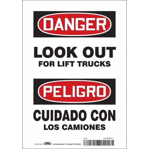 Safety Sign, Horizontal Rectangle, Number of Printed Sides 1, English, Spanish, Sign Format Traditional OSHA, Sign Legend Look Out For Lift Trucks/Cuidado Con Los Camiones, Sign Legend Background Color White, Sign Legend Style Text