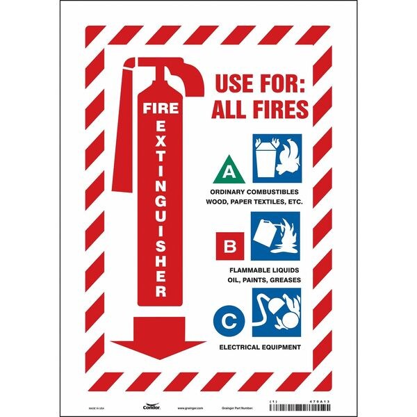 Safety Sign, Vertical Rectangle, Number of Printed Sides 1, English, Sign Format Other Format, Sign Legend A: Ordinary Combustibles, Wood, Paper, Textiles, Etc. B: Flammable Liquids Oils, Painting, Greases C: Electrical Equipment, Sign Legend Background Color Red; White, Sign Legend Style Symbol and Text