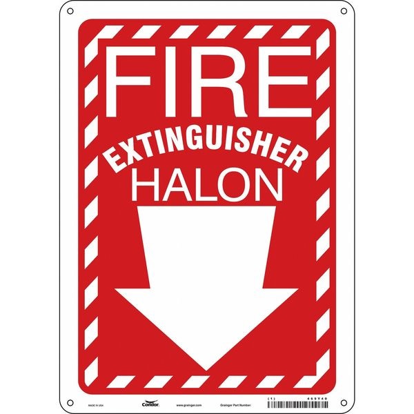 Safety Sign, Vertical Rectangle, Number of Printed Sides 1, English, Sign Format Other Format, Sign Legend Fire Extinguisher Halon, Sign Legend Background Color Red, White, Sign Legend Style Symbol and Text