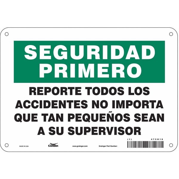 Safety Sign, Vertical Rectangle, Number of Printed Sides 1, Spanish, Sign Format Traditional OSHA, Sign Legend Reporte Todos Los Accidentes No Importa Que Tan Pequenos Sean A Su Supervisor, Sign Legend Background Color White, Sign Legend Style Text