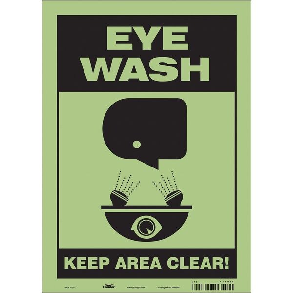 Safety Sign, Vertical Rectangle, Number of Printed Sides 1, English, Sign Format Other Format, Sign Legend Eye Wash Keep Area Clear!, Sign Legend Background Color Black, Yellow, Sign Legend Style Symbol and Text