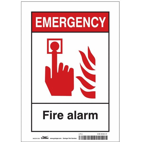 Safety Sign, Horizontal Rectangle, Number of Printed Sides 1, English, Sign Format Other Format, Sign Legend Emergency Fire Alarm, Sign Legend Background Color Red, White, Sign Legend Style Symbol and Text