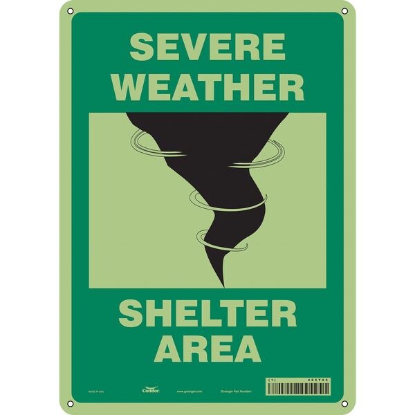 Safety Sign, Vertical Rectangle, Number of Printed Sides 1, English, Sign Format Other Format, Sign Legend Severe Weather Shelter Area, Sign Legend Background Color Green, Sign Legend Style Symbol and Text