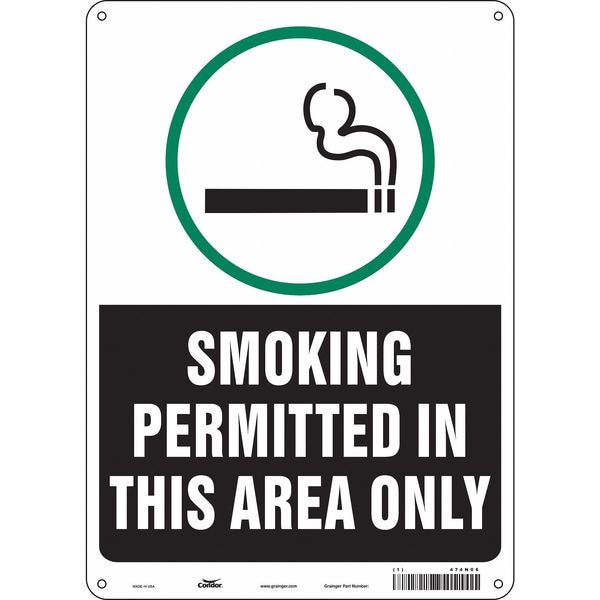 Safety Sign, Vertical Rectangle, Number of Printed Sides 1, English, Sign Format Other Format, Sign Legend Smoking Permitted In This Area Only, Sign Legend Background Color Black, White, Sign Legend Style Symbol and Text