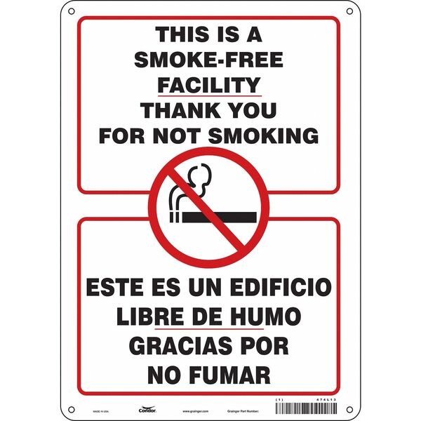 Safety Sign, Vertical Rectangle, Number of Printed Sides 1, English, Spanish, Sign Format Other Format, Sign Legend This Is A Smoke- Free Facility Thank You For Not Smoking/Este Es Un Edificio Libre De Humo Gracias Por No Fumar, Sign Legend Background Color White, Sign Legend Style Symbol and Text