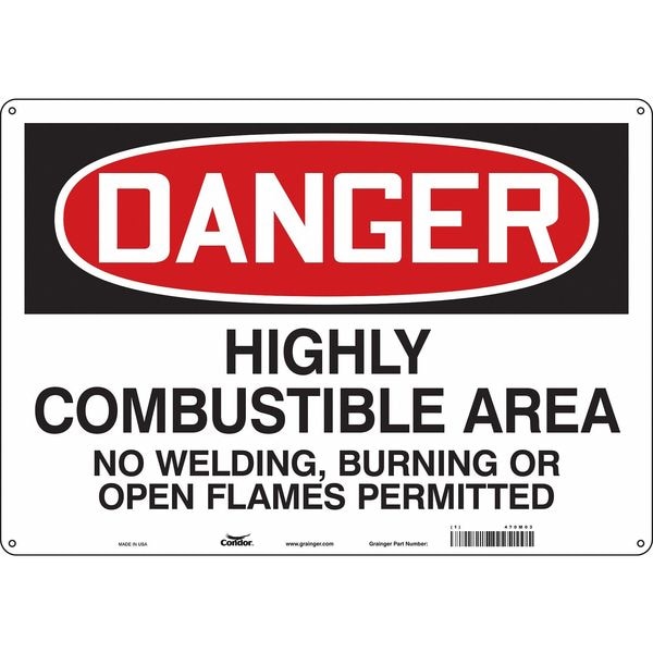 Safety Sign, Horizontal Rectangle, Number of Printed Sides 1, English, Sign Format Traditional OSHA, Sign Legend Highly Combustible Area No Welding, Burning Or Open Flames Permitted, Sign Legend Background Color White, Sign Legend Style Text