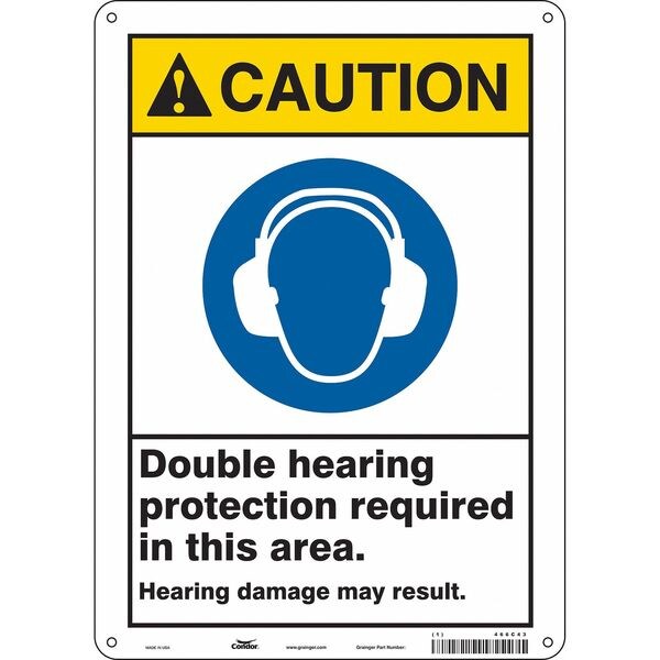 Safety Sign, Vertical Rectangle, Number of Printed Sides 1, English, Sign Format ANSI/OSHA Format, Sign Legend Double Hearing Protection Required In This Area. Hearing Damage May Result., Sign Legend Background Color White, Sign Legend Style Symbol and Text