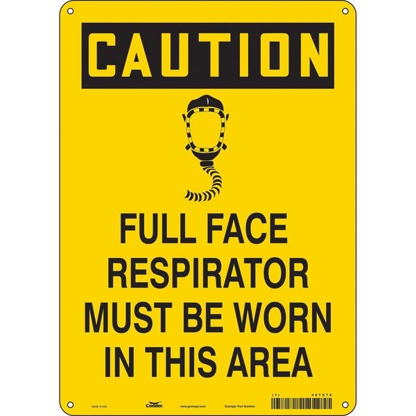 Safety Sign, Vertical Rectangle, Number of Printed Sides 1, English, Sign Format Traditional OSHA, Sign Legend Full Face Respirator Must Be Worn In This Area, Sign Legend Background Color Yellow, Sign Legend Style Symbol and Text