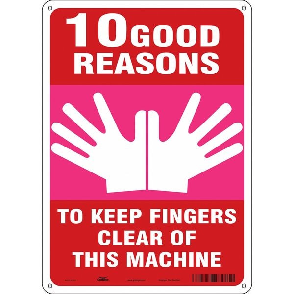 Safety Sign, Vertical Rectangle, Number of Printed Sides 1, English, Sign Format Other Format, Sign Legend 10 Good Reasons To Keep Fingers Clear Off This Machine, Sign Legend Background Color Red, Sign Legend Style Symbol and Text