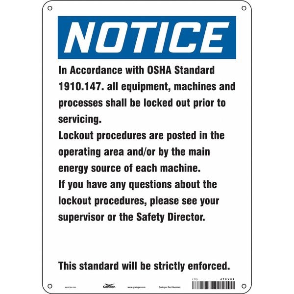 Safety Sign, Vertical Rectangle, Number of Printed Sides 1, English, Sign Format Traditional OSHA, Sign Legend In Accordance With Osha Standard 1910.147, All Equipment, Machines And Processes Shall Be Locked Out Prior To Servicing. Lockout Procedures Are Posted In The Operating Area And/Or By The Main Energy Source Of Each Machine. If You Have Any Questions About, Sign Legend Background Color White, Sign Legend Style Text