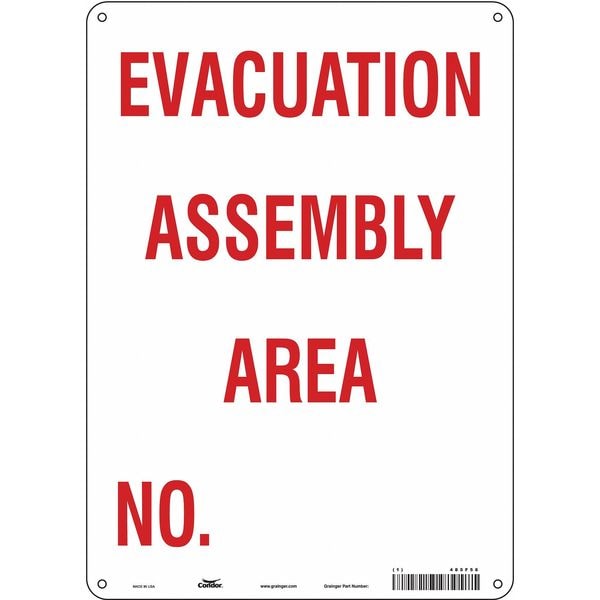 Safety Sign, Vertical Rectangle, Number of Printed Sides 1, English, Sign Legend Evacuation Assembly Area No., Sign Legend Background Color White, Sign Legend Style Text