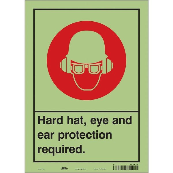 Safety Sign, Vertical Rectangle, Number of Printed Sides 1, English, Sign Format Other Format, Sign Legend Hard Hat, Eye And Ear Protection Required., Sign Legend Background Color White, Sign Legend Style Symbol and Text