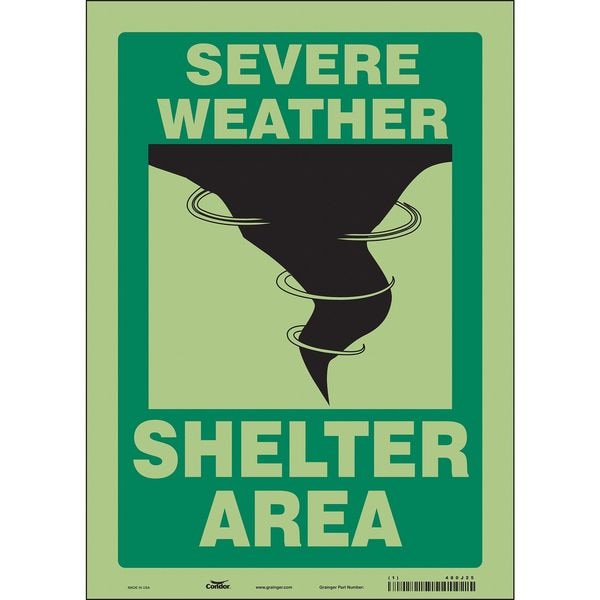Safety Sign, Vertical Rectangle, Number of Printed Sides 1, English, Sign Legend Severe Weather Shelter Area, Sign Legend Background Color Green, Sign Legend Style Symbol and Text