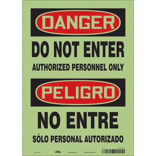 Safety Sign, 14 in Height, 10 in Width, Glow Vinyl, Vertical Rectangle, English, Spanish