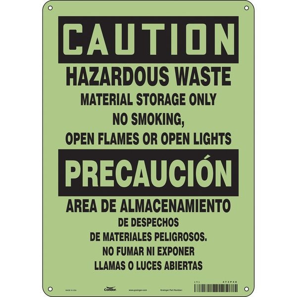 Safety Sign, Vertical Rectangle, Number of Printed Sides 1, English, Spanish, Sign Format Traditional OSHA, Sign Legend Hazardous Waste Material Storage Only No Smoking, Open Flames Or Open Lights/Area De Almacenamiento De Desechos De Materiales Peligrosos. No Fumar Ni Exponer Llamas O Luces Abiertas, Sign Legend Background Color Yellow, Sign Legend Style Text