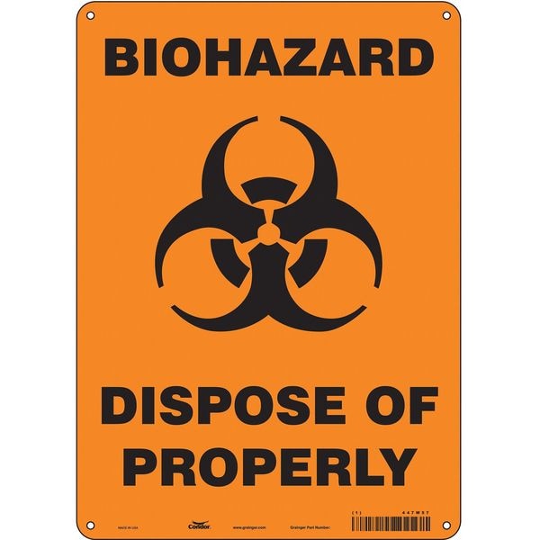 Safety Sign, Vertical Rectangle, Number of Printed Sides 1, English, Sign Format Other Format, Sign Legend Biohazard Dispose Of Properly, Sign Legend Background Color Orange, Sign Legend Style Symbol and Text
