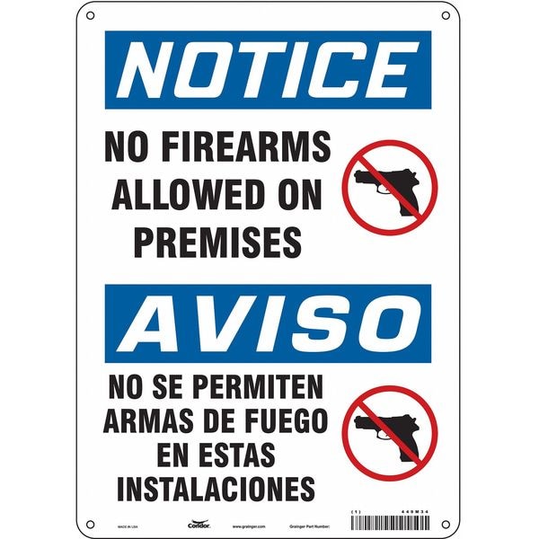 Safety Sign, Vertical Rectangle, Number of Printed Sides 1, English, Sign Legend No Firearms Allowed On Premises/No Se Permiten Armas De Fuego En Estas Instalaciones, Sign Legend Background Color White, Sign Legend Style Symbol and Text