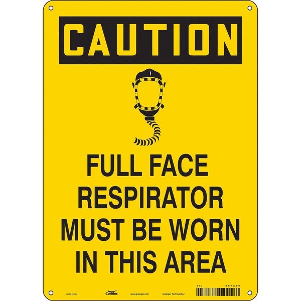 Safety Sign, Vertical Rectangle, Number of Printed Sides 1, English, Sign Format Traditional OSHA, Sign Legend Full Face Respirator Must Be Worn In This Area, Sign Legend Background Color Yellow, Sign Legend Style Symbol and Text