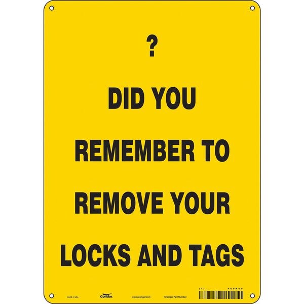 Safety Sign, Vertical Rectangle, Number of Printed Sides 1, English, Sign Format Other Format, Sign Legend ? Did You Remember To Remove Your Locks And Tags, Sign Legend Background Color Yellow, Sign Legend Style Symbol and Text