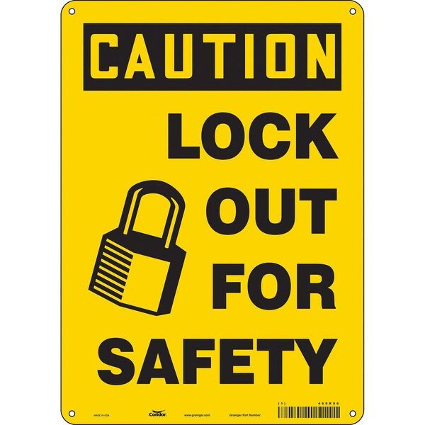 Safety Sign, Vertical Rectangle, Number of Printed Sides 1, English, Sign Format Traditional OSHA, Sign Legend Lock Out For Safety, Sign Legend Background Color Yellow, Sign Legend Style Symbol and Text