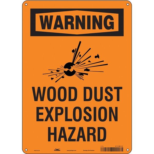 Safety Sign, Vertical Rectangle, Number of Printed Sides 1, English, Sign Format Traditional OSHA, Sign Legend Wood Dust Explosion Hazard, Sign Legend Background Color Orange, Sign Legend Style Symbol and Text