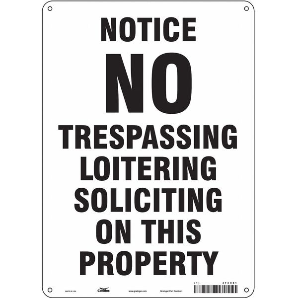 Safety Sign, Vertical Rectangle, Number of Printed Sides 1, English, Sign Format Other Format, Sign Legend No Trespassing Loitering Soliciting On This Property, Sign Legend Background Color White, Sign Legend Style Text