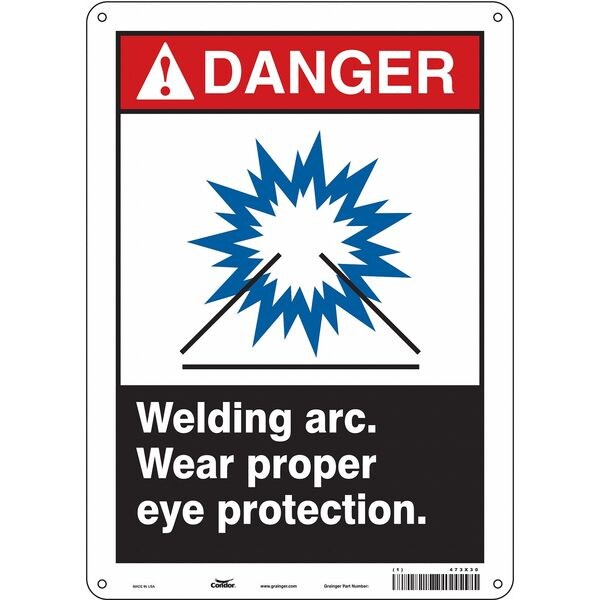 Safety Sign, Vertical Rectangle, Number of Printed Sides 1, English, Sign Format ANSI/OSHA Format, Sign Legend Welding Arc. Wear Proper Eye Protection., Sign Legend Background Color Black, White, Sign Legend Style Symbol and Text