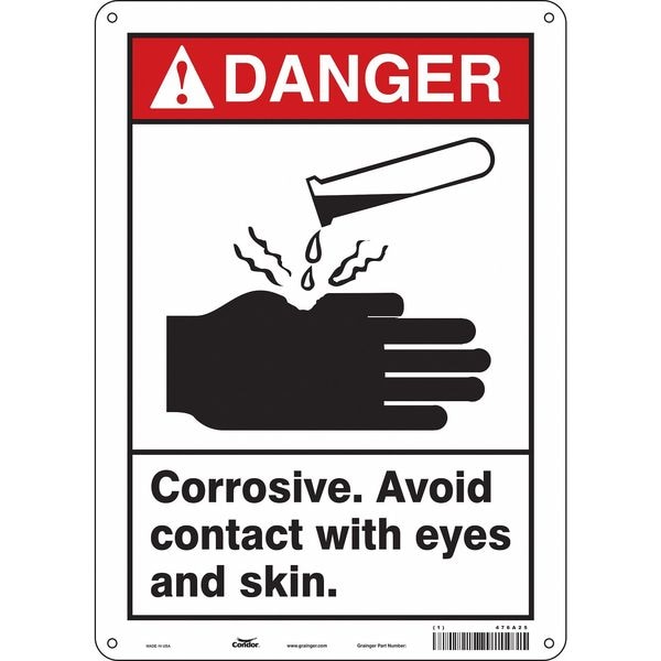 Safety Sign, Vertical Rectangle, Number of Printed Sides 1, English, Sign Format ANSI/OSHA Format, Sign Legend Corrosive. Avoid Contact With Eyes And Skin., Sign Legend Background Color White, Sign Legend Style Symbol and Text