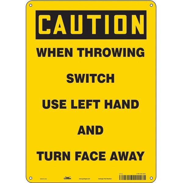 Safety Sign, Vertical Rectangle, Number of Printed Sides 1, English, Sign Format Traditional OSHA, Sign Legend When Throwing Switch Use Left Hand And Turn Face Away, Sign Legend Background Color Yellow, Sign Legend Style Text