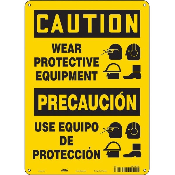 Safety Sign, Vertical Rectangle, Number of Printed Sides 1, English, Spanish, Sign Format Traditional OSHA, Sign Legend Wear Protective Equipment/Use Equipo De Proteccion, Sign Legend Background Color Yellow, Sign Legend Style Symbol and Text