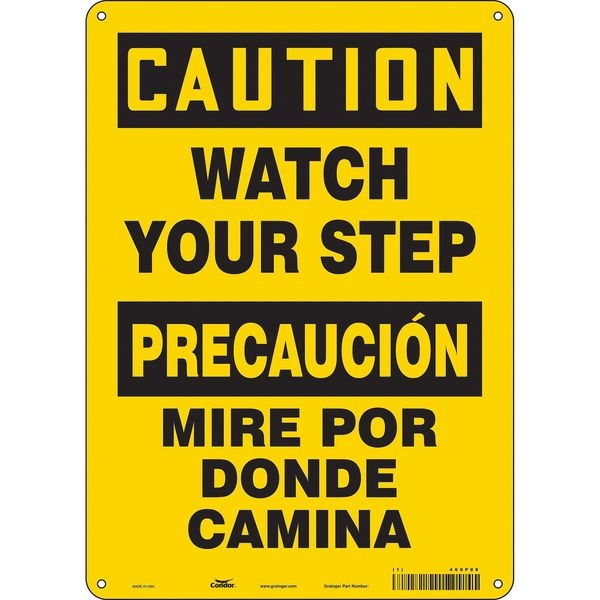 Safety Sign, Vertical Rectangle, Number of Printed Sides 1, English, Spanish, Sign Format Traditional OSHA, Sign Legend Watch Your Step/Mire Por Donde Camina, Sign Legend Background Color Yellow, Sign Legend Style Text