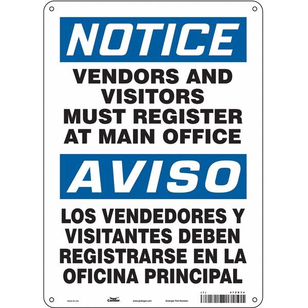 Safety Sign, Vertical Rectangle, Number of Printed Sides 1, English, Spanish, Sign Format Traditional OSHA, Sign Legend Vendors And Visitors Must Register At Main Office/Los Vendedores Y Visitantes Deben Registrarse En La Oficina Principal, Sign Legend Background Color White, Sign Legend Style Text