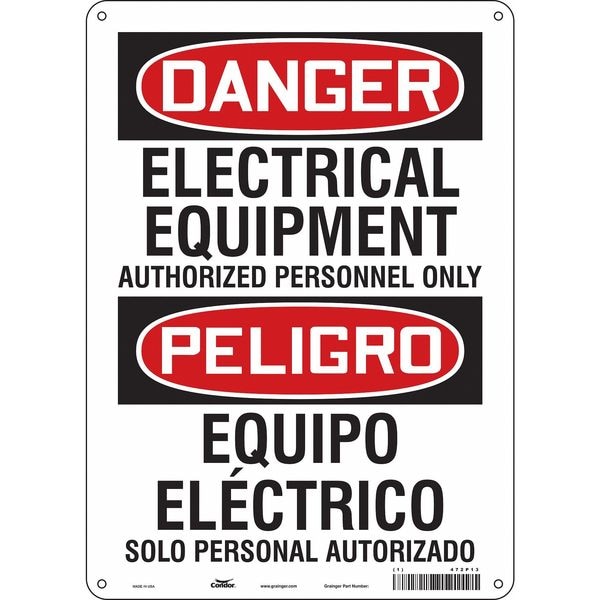 Safety Sign, Vertical Rectangle, Number of Printed Sides 1, English, Spanish, Sign Format Traditional OSHA, Sign Legend Electrical Equipment Authorized Personnel Only/Equipo Electrico Solo Personal Autorizado, Sign Legend Background Color White, Sign Legend Style Text