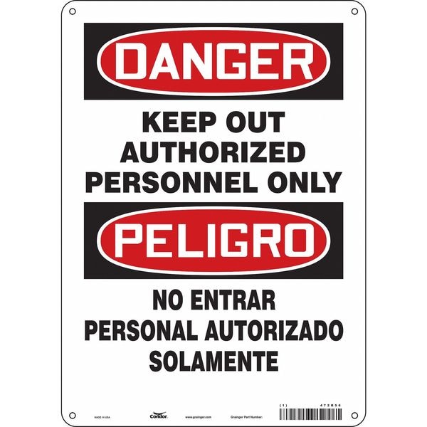 Safety Sign, Vertical Rectangle, Number of Printed Sides 1, English, Spanish, Sign Format Traditional OSHA, Sign Legend Keep Out Authorized Personnel Only/No Entrar Personal Autorizado Solamente, Sign Legend Background Color White, Sign Legend Style Text