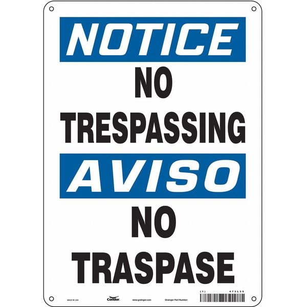 Safety Sign, Vertical Rectangle, Number of Printed Sides 1, English, Spanish, Sign Format Traditional OSHA, Sign Legend No Trespassing/No Traspase, Sign Legend Background Color White, Sign Legend Style Text