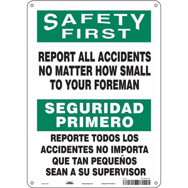 Safety Sign, Vertical Rectangle, Number of Printed Sides 1, English, Spanish, Sign Format Traditional OSHA, Sign Legend Report All Accidents No Matter How Small To Your Foreman/Reporte Todos Los Accidentes No Importa Que Tan Pequenos Sean A Su Supervisor, Sign Legend Background Color White, Sign Legend Style Text